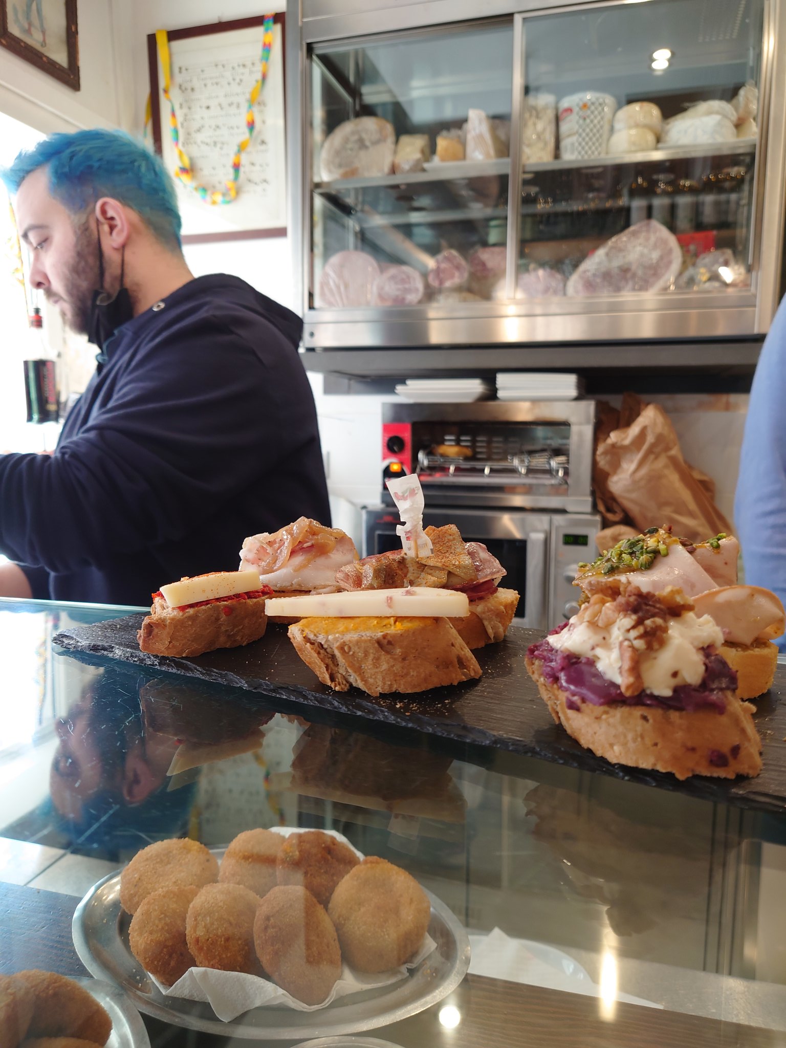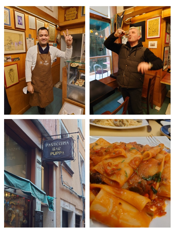 He served us what looked like a lap pool of zucchini and gamberi risotto for two for a total of €15. We also had potato and vegetable Cicchetti and polpette made with couscous. His Aperol spritz and Negronis are legendary, and I love his playlists. The next day we returned and had a Spaghetti con Vongole and a spicy paccheri, which he is massively proud of -as he should be. Masud is lovely to chat with, and his customers seem to adore him, and after just a few minutes, I did too. When I asked for a photo, one of his regulars was disappointed that he was to be left out. So we snapped him too as he tipped back his glass until the wine ran down his chin. That’s the kind of place this is.